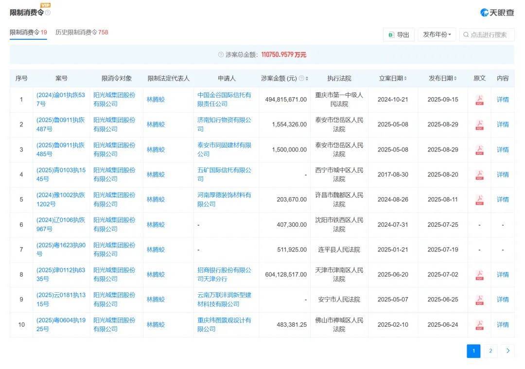 2024年3月,阳光城创始人、福建百亿富豪林腾蛟卸任法定代表人、董事长,朱荣斌卸任总经理,由施志敏担任法定代表人、董事长、总经理。同时,公司董事、监事均发生变更。林腾蛟曾以170亿元的身家位列《2020胡润全球房地产富豪榜》第119位,如今已被限制高消费,名下目前仍有19条限消令,涉案总金额超过10亿元。