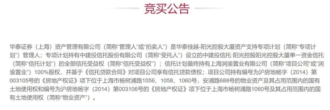 据竞买公告,上述物业资产的处置方是华泰证券(上海)资产管理有限公司,该公司是“华泰佳越-阳光控股大厦资产支持专项计划”的管理人;物业资产标的所涉及的债务人为上海润渝置业有限公司和上海臻德房地产开发有限公司,所涉债权初始金额为9.33亿元;而其债权人则为中建投信托股份有限公司。
