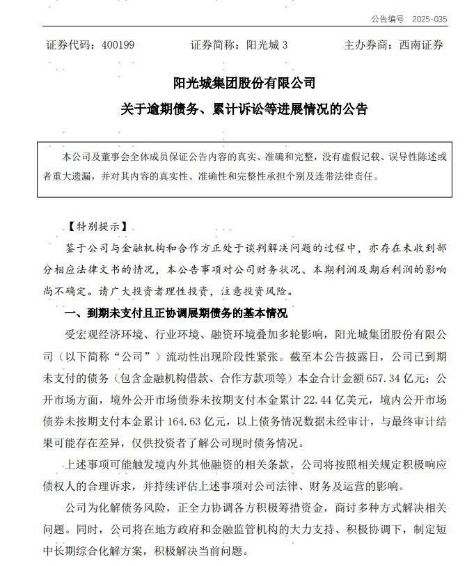 据阳光城公告,截至今年9月25日,阳光城已到期未支付的债务(包含金融机构借款、合作方款项等)本金合计金额657.34亿元;公开市场方面,境外公开市场债券未按期支付本金累计22.44亿美元,境内公开市场债券未按期支付本金累计164.63亿元。